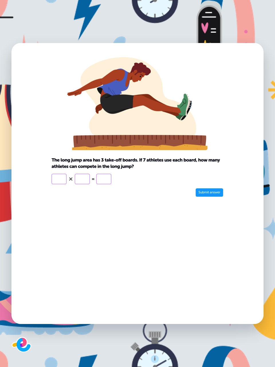 Learners solve multiplication word problems set in athletics events, using images and interactive equation questions to connect maths with real-world sports scenarios. Ideal for practising multiplication facts from 1 to 10.